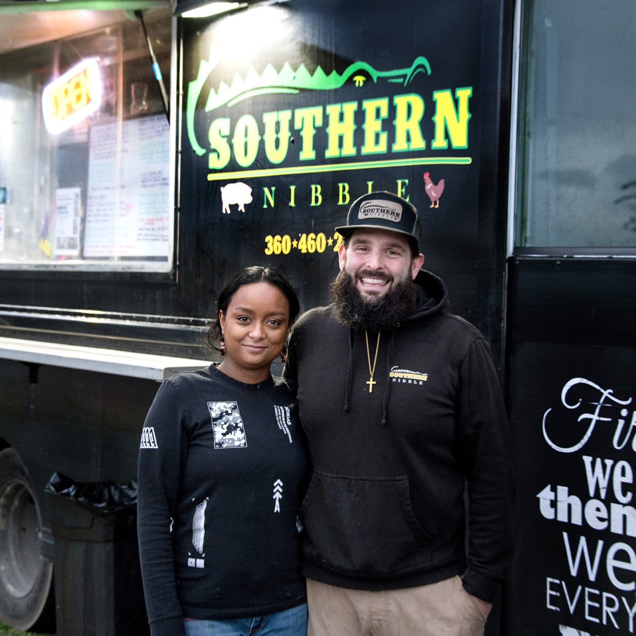 The menu at Southern Nibble includes chicken tenders with a variety of sauces, pork sliders, mac-n-cheese, fried pickles, BBQ wings, and other Southern delights. View their menu and find their truck on the Southern Nibble Facebook page.